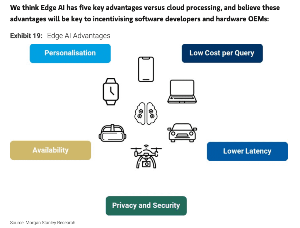 While it may not be as evident now, 2024 is going to see a significant shift in the narrative from purely cloud-based inference of AI and LLMs to local on-device processing. I came across a report last night from Morgan Stanley research making the same key points I am sharing this slide as the key advantages to edge AI.