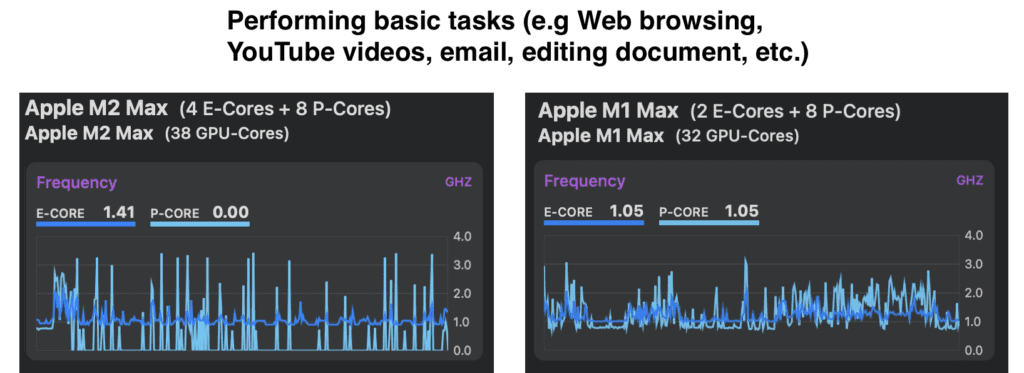 For five days now, I’ve been using the new 16″ Macbook Pro with M2 Max. My prior Mac was the 16″ Macbook Pro with M1 Max. Battery life with M-series processors is already industry-leading but Apple has made a few changes architecturally to M2 Pro and Max with the addition of 2 more E (efficiency) cores compared to M1 Pro/Max. Apple stated the M2 Pro and Max have next-generation CPUs and GPUs over their predecessors and I was curious about what subtle changes to the CPU/GPU architecture were. Throughout these past five days, and using a tool to monitor M2 Max’s wattage use and frequency of the e-cores and p-cores, I believe Apple made two subtle changes. First, they made high-performance cores more efficient. When designing chips to be more efficient, and thus draw less power, one goal is to optimize to perform their workload and then get to a zero state as quickly as possible. While monitoring my Mac with M2 Max and my old Mac with M1 Max, I noticed the high-performance cores reach a zero state, and interestingly the M1 Max cores do not. Here is a side-by-side image of normal usage (web browsing, watching YouTube videos, working on editing a document, etc., on both Macs.