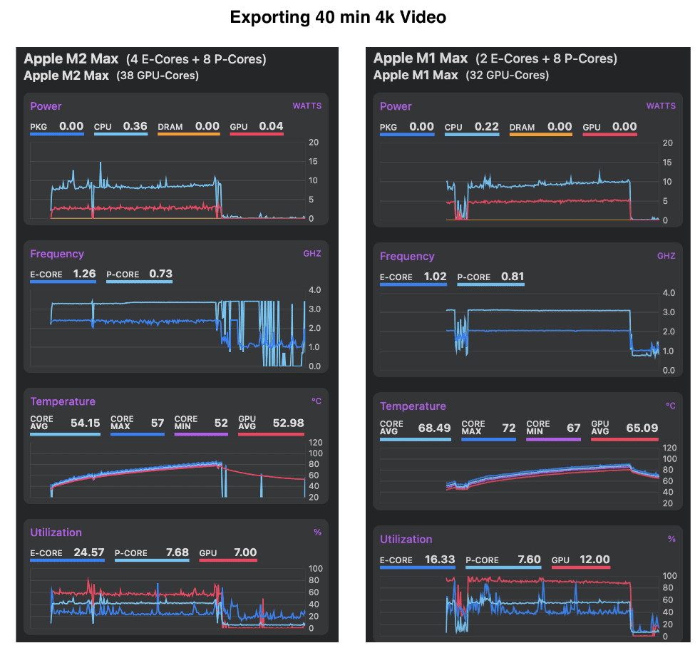 - M2 Max appeared to have better temperature management dropping the temperature of the performance and efficiency cores much more quickly compared to M1 Max.