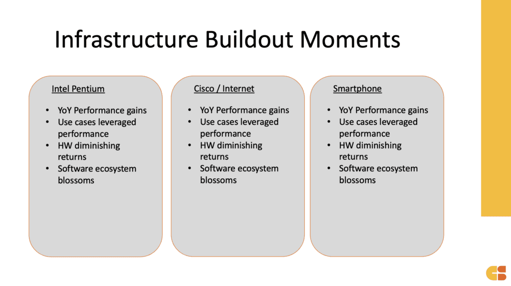I showed this slide as a historical view of several industry cycles that drove an infrastructure buildout (of compute) and led a software boom. Essentially, there are three main events that shaped the industry as we have it today.